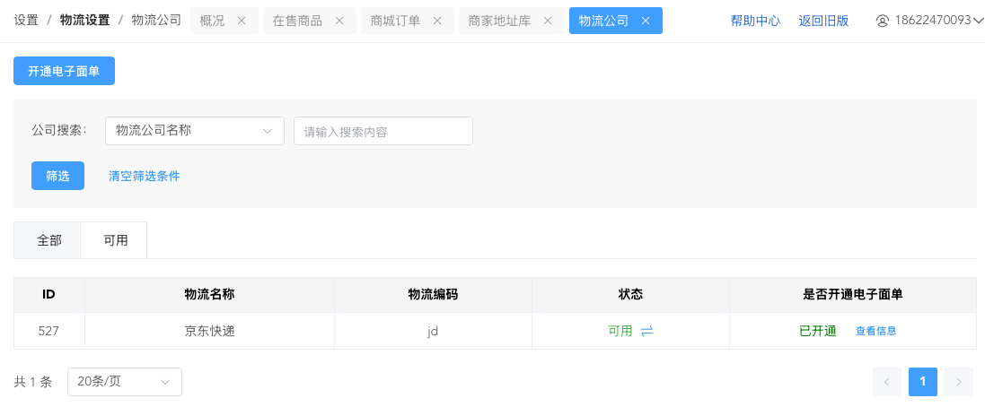 4. 物流:在【店铺后台-设置-物流设置】中开启对接的物流公司,将状态调整成可用,则在后续的订单发货时可以选择该物流公司。