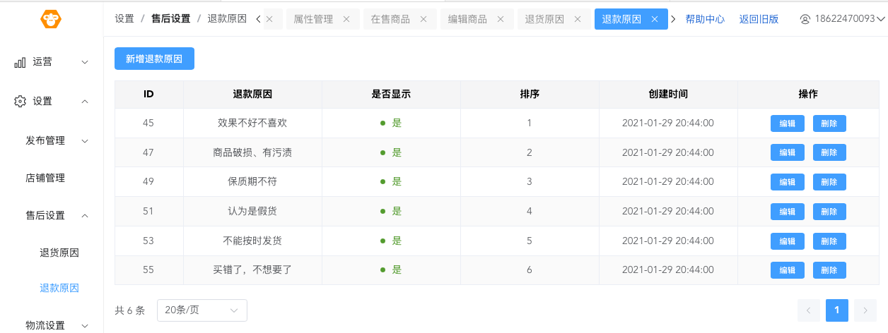 3. 售后原因:在【店铺后台-设置-售后设置】可以调整退货/退款/取消订单的原因