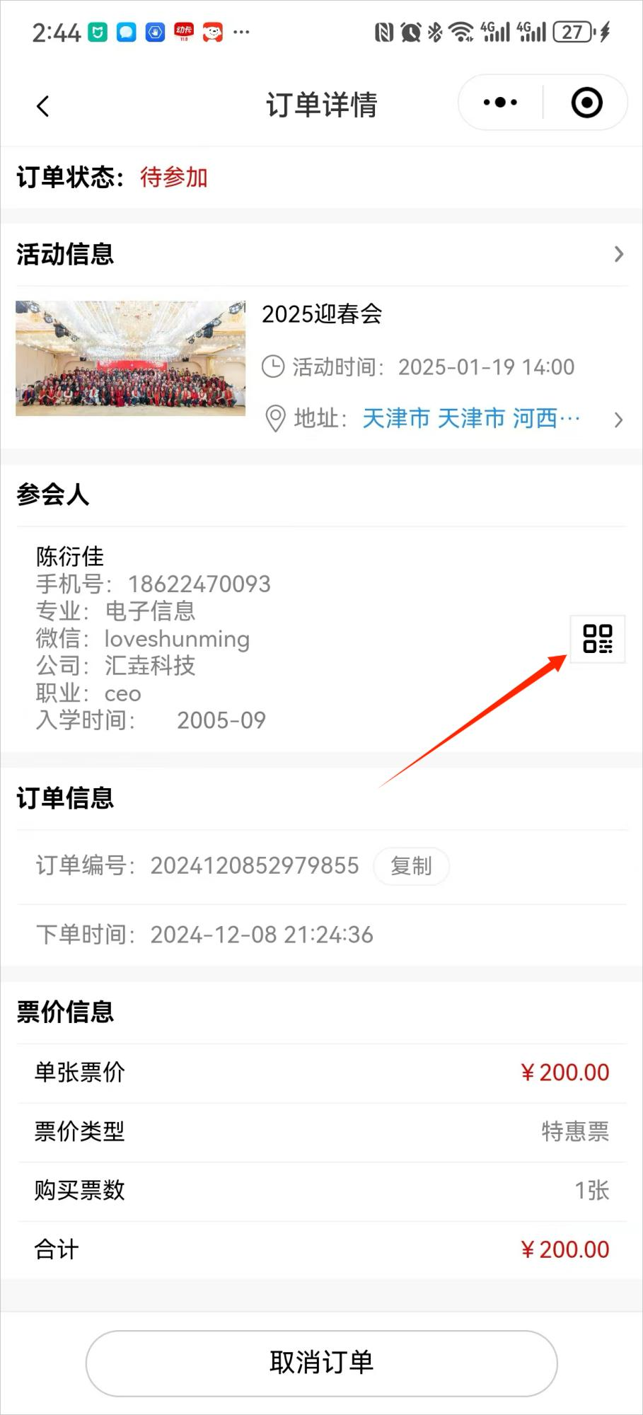 用户的签到码引导用户在小程序我的订单中打开