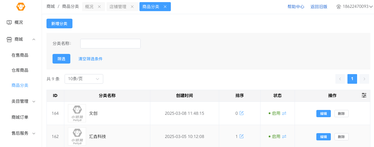1.新增分类:管理员在【店铺后台-商城-商品分类-新增分类】,输入分类名称,添加图片,设置分组状态,排序,最后保存。