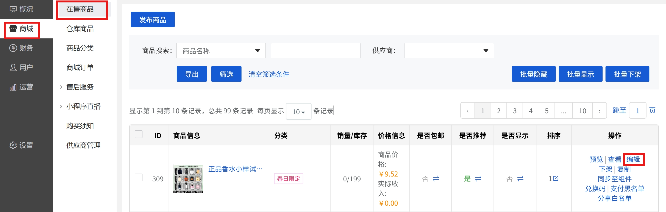 可在【商城-在售商品-目标商品-编辑】中更改商品会员折扣设置