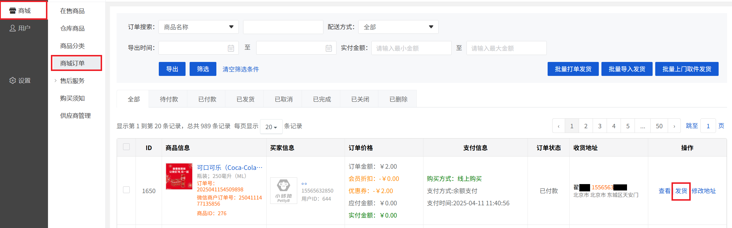 2. 批量发货:在【商城-商城订单】可以查看全部商城订单,勾选需要发货的目标订单,点击【批量发货】