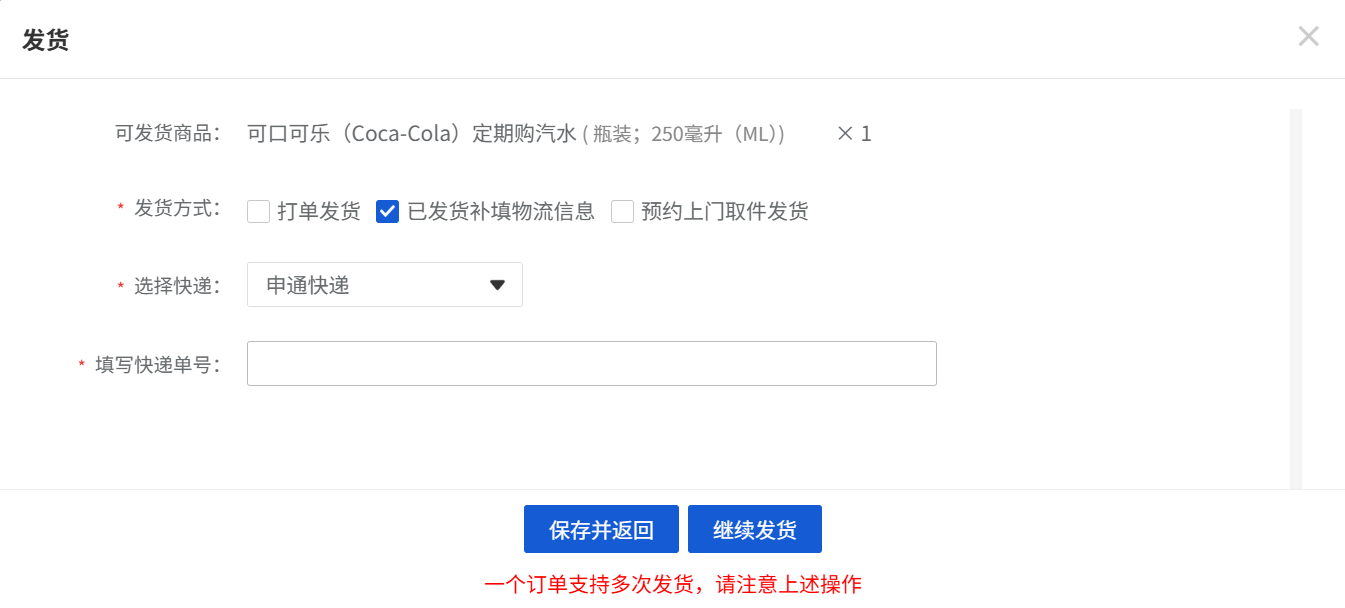 1. 单次发货:在【商城-商城订单】可以查看全部商城订单,找到需要发货的目标订单,点击【发货】,在【发货】中进行发货信息的填写,最后点击【保存并返回】,完成发货