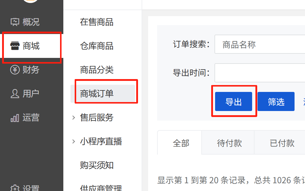 可以按照商品名称、买家昵称、订单编号以及配送方式进行筛选,还可以通过时间段进行筛选,筛选后即可进行导出